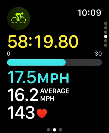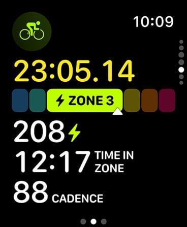 A Power Zones meter in the Workouts app presents the data in the form of current power, time in zone, and cycling average in segments ranging from easy to hard, allowing you to improve performance over time.